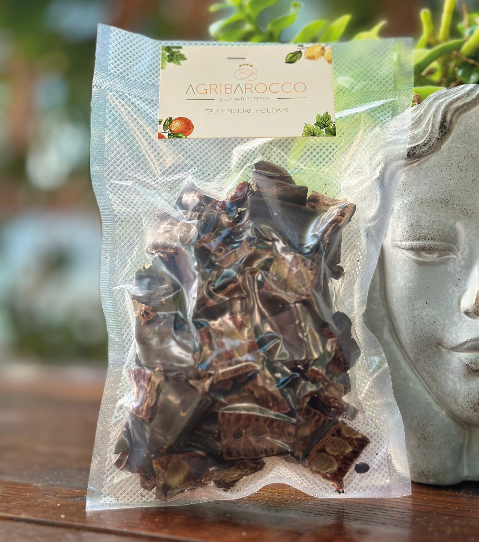 Carrube Tostate Siciliane: un dolcificante naturale, croccante e salutare. Gusto simile al cioccolato, senza caffeina. Ideali come snack o infuso.