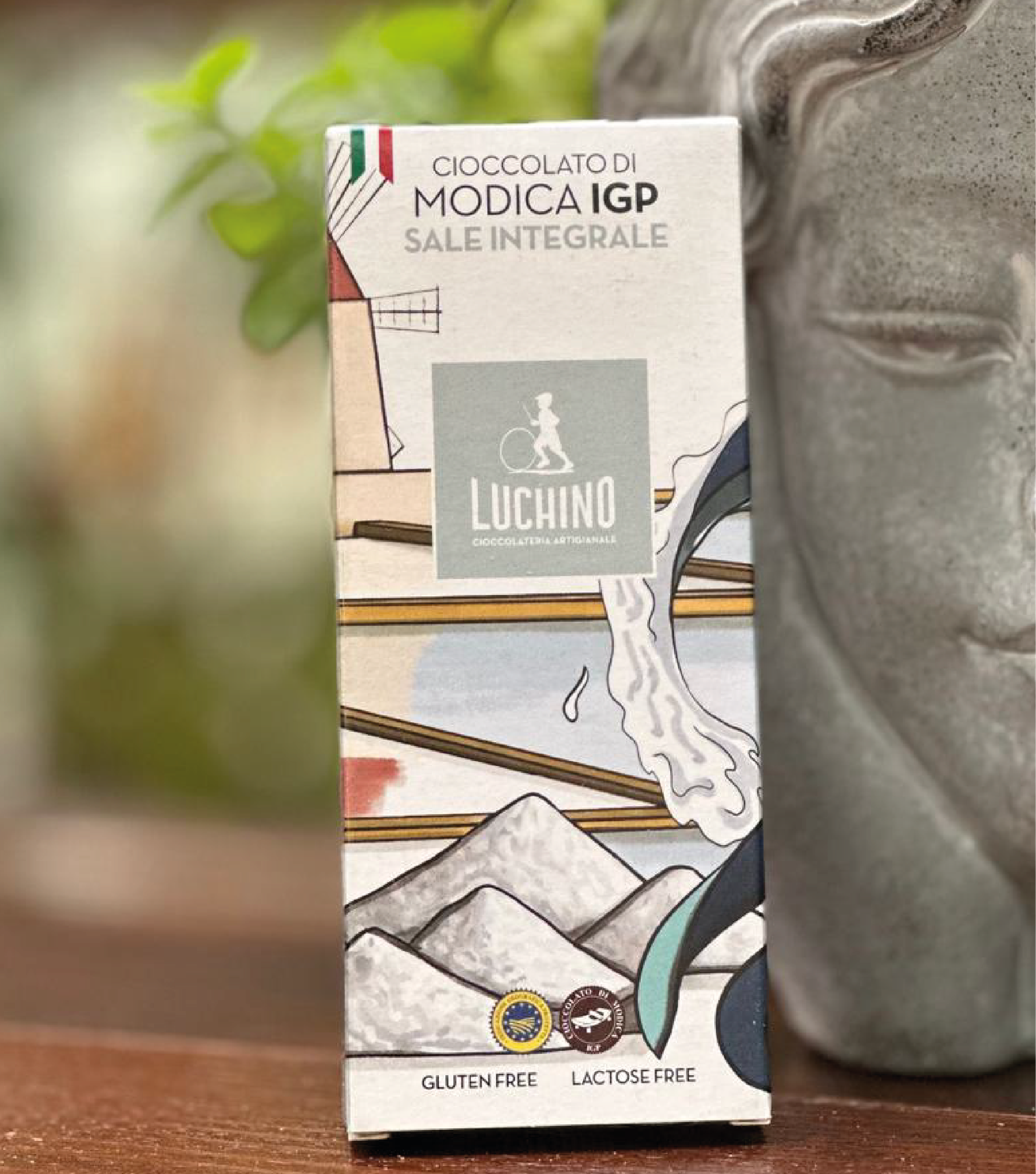 Il Cioccolato di Modica al Sale Integrale è un prodotto artigianale tipico della Città di Modica con marchio IGP. L’armonia dei contrasti. Cacao lavorato a freddo con cristalli di sale integrale. Gusto complesso e friabile.