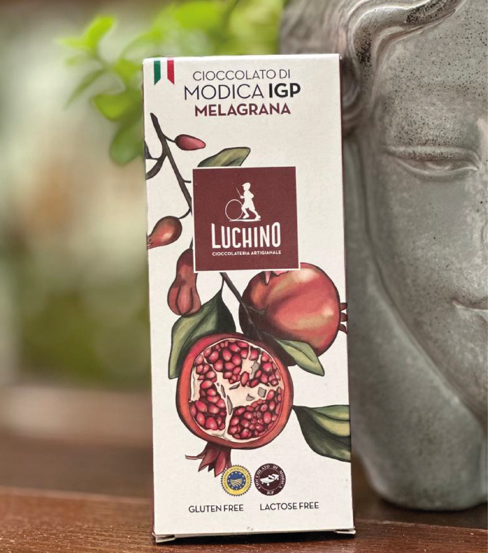 Il Cioccolato di Modica alla Melagrana è un prodotto artigianale tipico della Città di Modica con marchio IGP. Fondente lavorato a freddo con una nota acidula e fruttata di melagrana. Gusto sofisticato e texture granulosa.