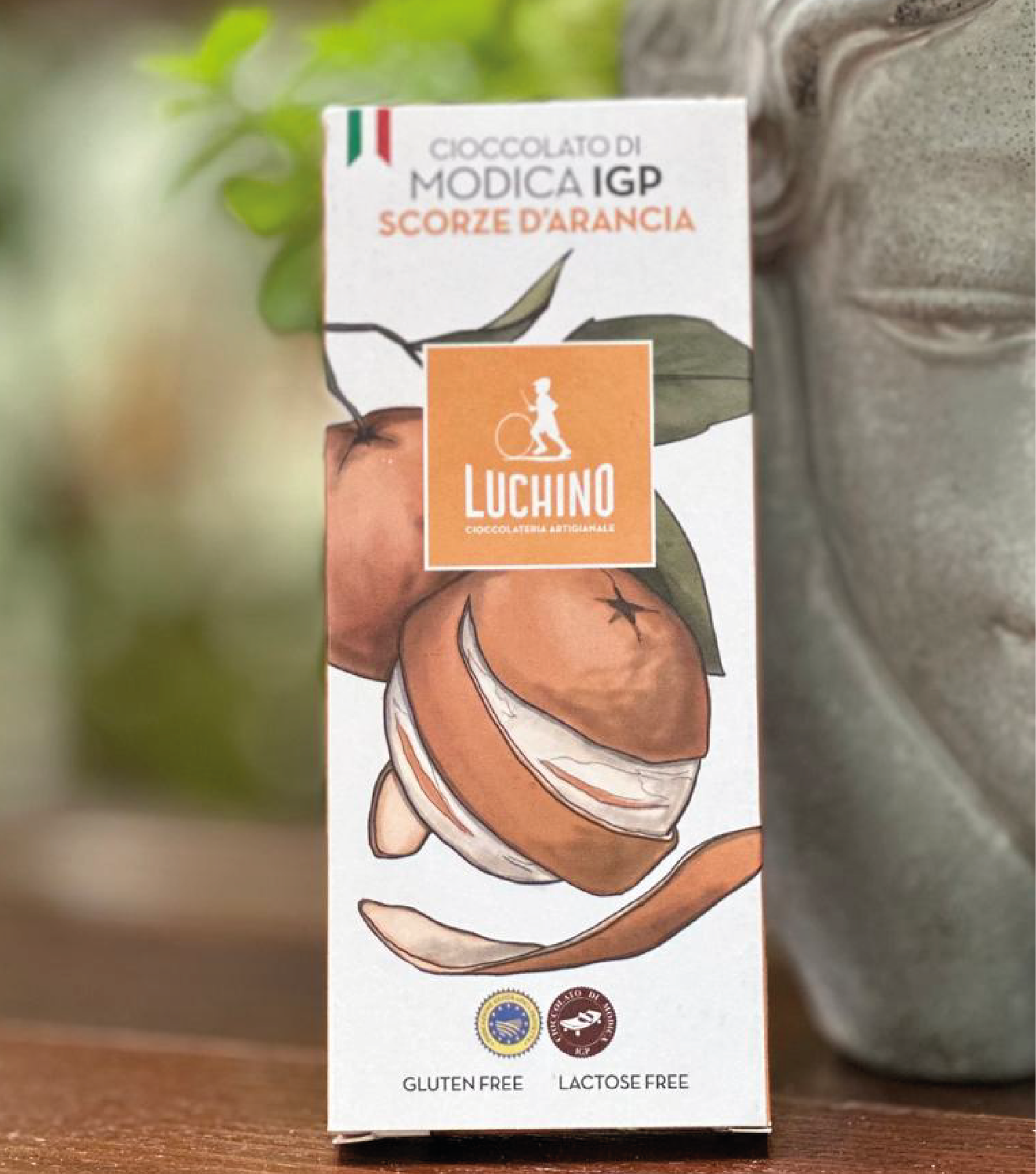 Il Cioccolato di Modica alle Scorze d’Arancia è un prodotto artigianale tipico della Città di Modica con marchio IGP. Cacao lavorato a freddo con pezzetti di arancia candita. Gusto classico e texture granulosa. Sapore di Sicilia.
